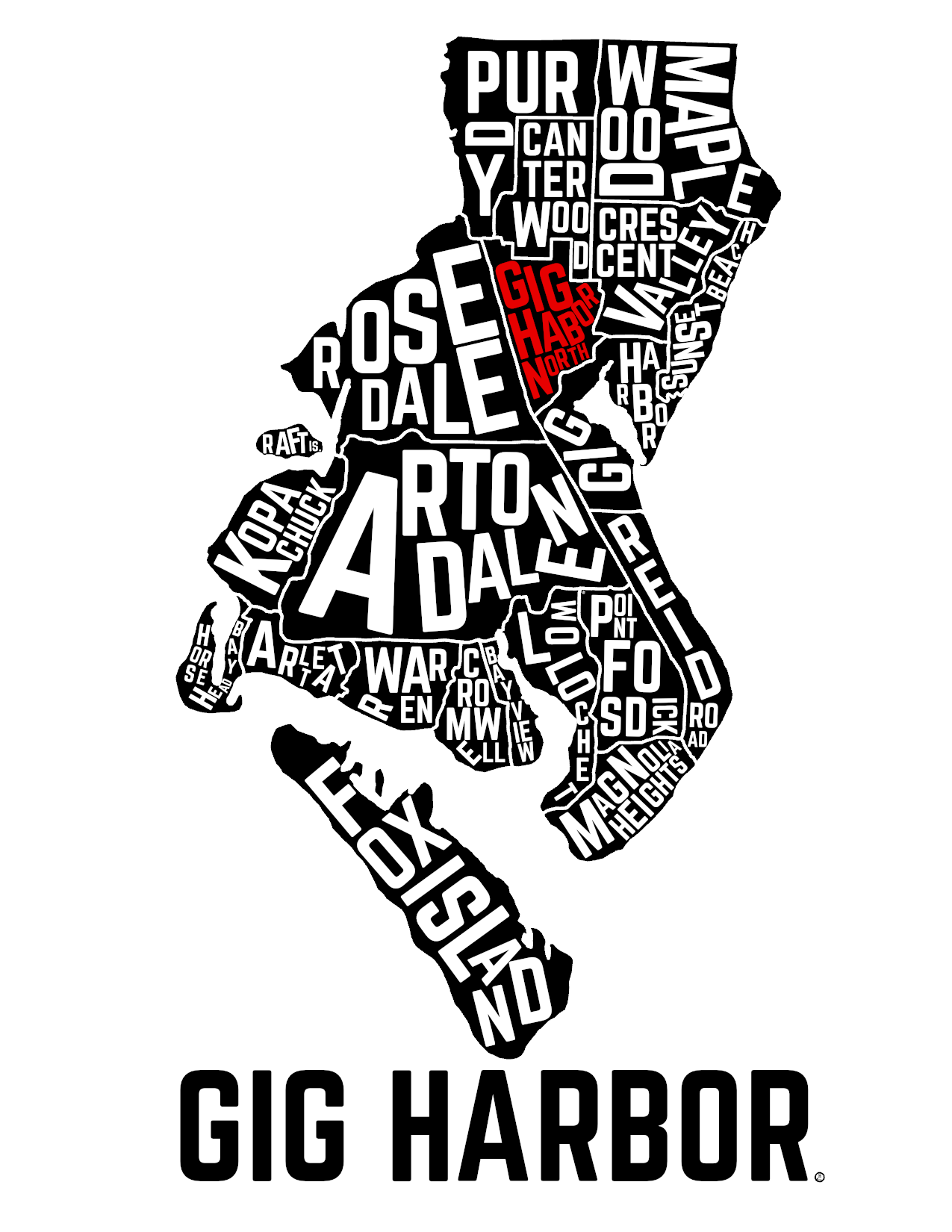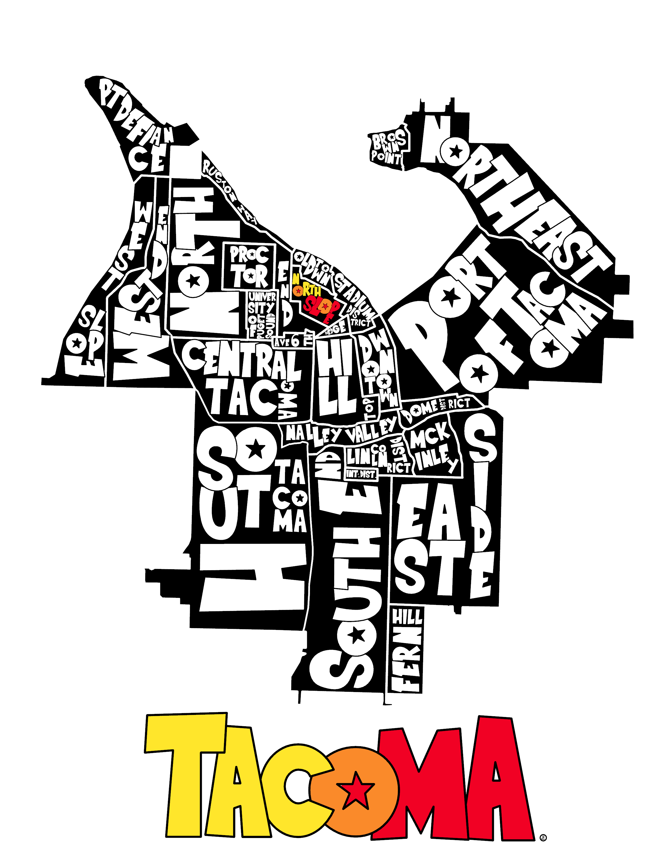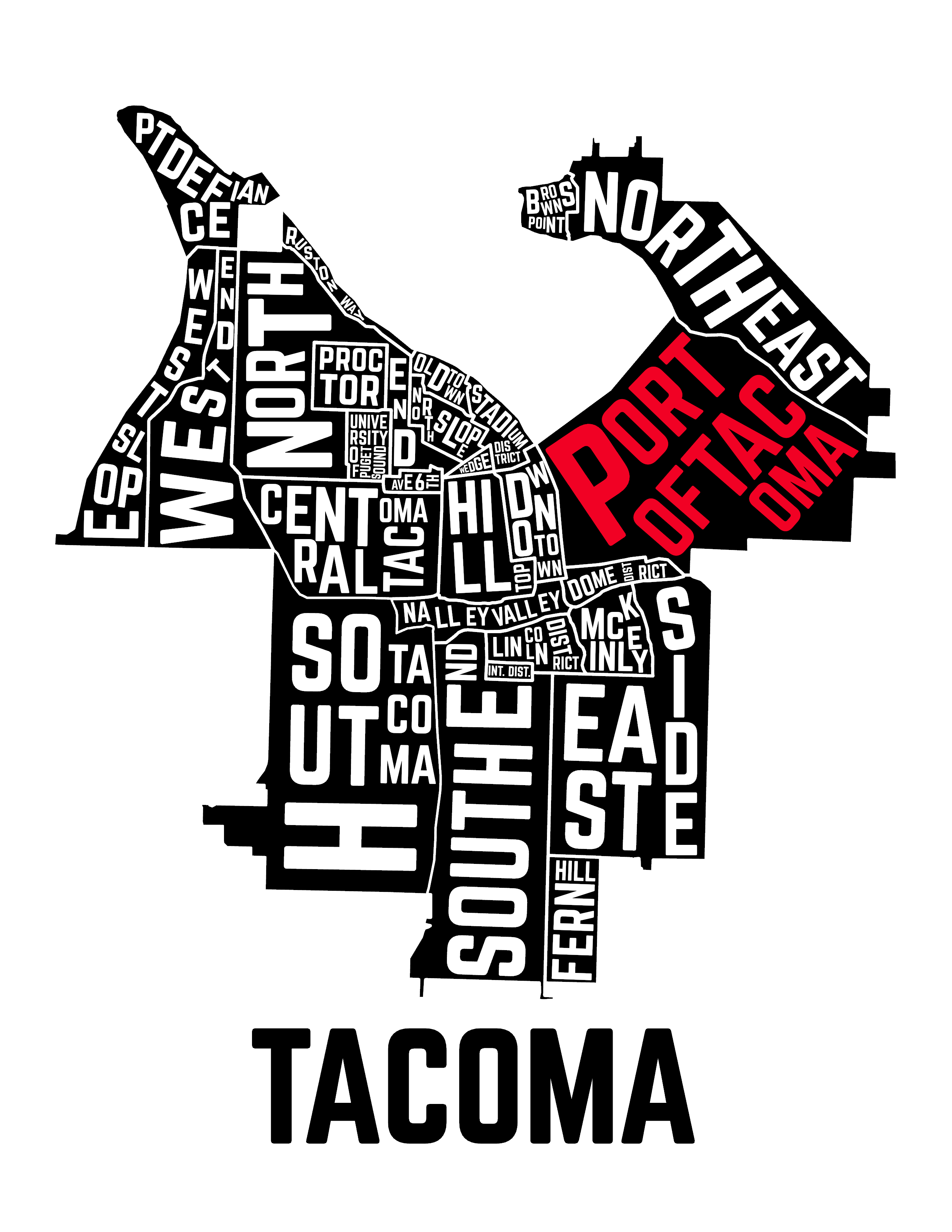 Created as a Rogue Monkeyshine in 2025, this typographic Tacoma map was the original piece that launched the project. Born out of the absence of an accurate, readily available Tacoma neighborhood map, it was designed to be hidden, found, and shared. -