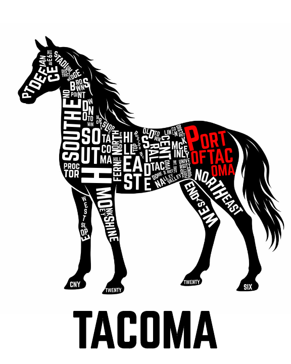 A Tacoma neighborhood map transformed into the shape of a horse, created as part of the Monkeyshines tradition. This project blends place, symbolism, and public art, turning familiar neighborhood names into a piece meant to be discovered, photographed, and passed along.
