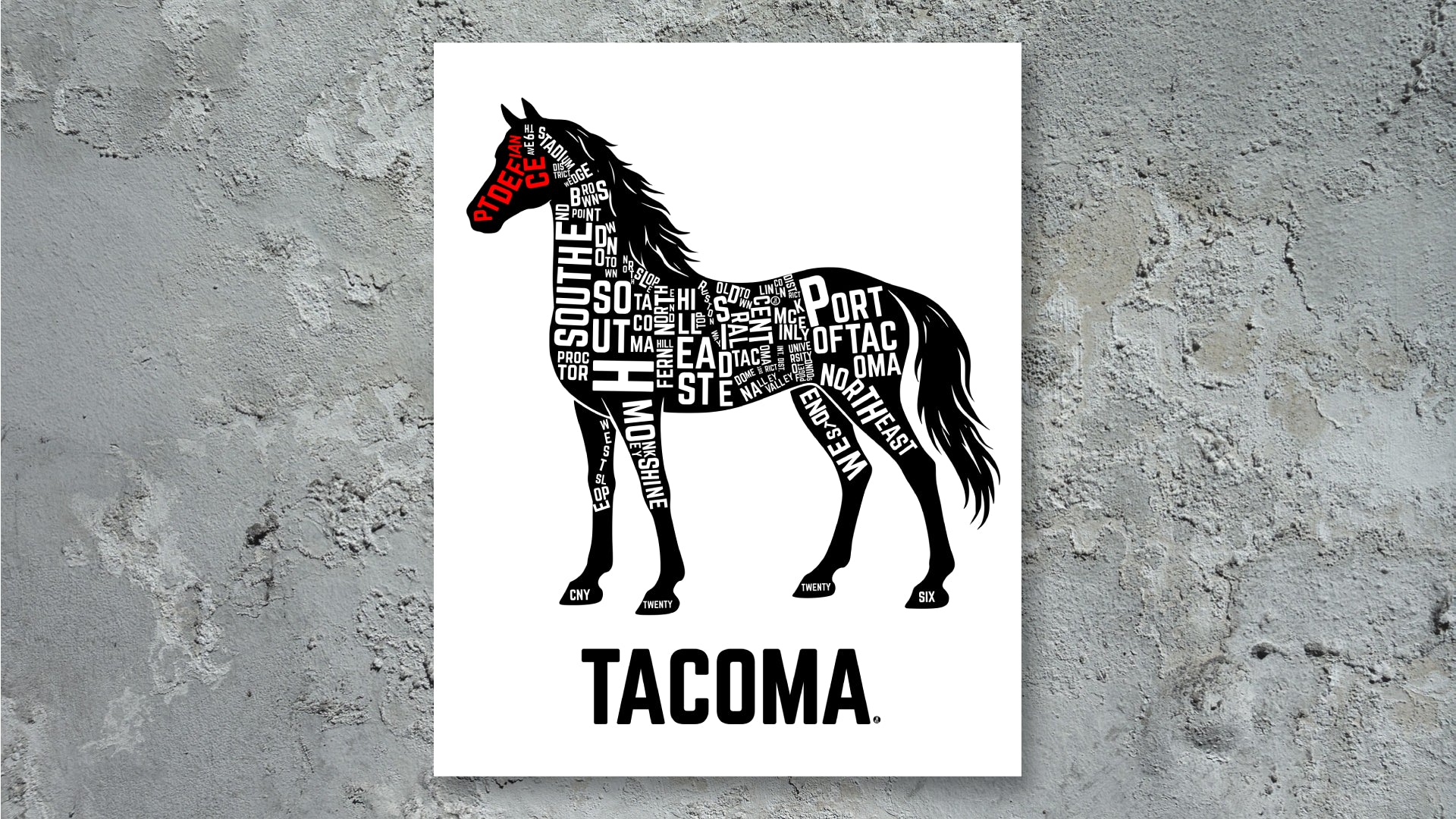 A Tacoma neighborhood map transformed into the shape of a horse, created as part of the Monkeyshines tradition. This project blends place, symbolism, and public art, turning familiar neighborhood names into a piece meant to be discovered, photographed, and passed along.