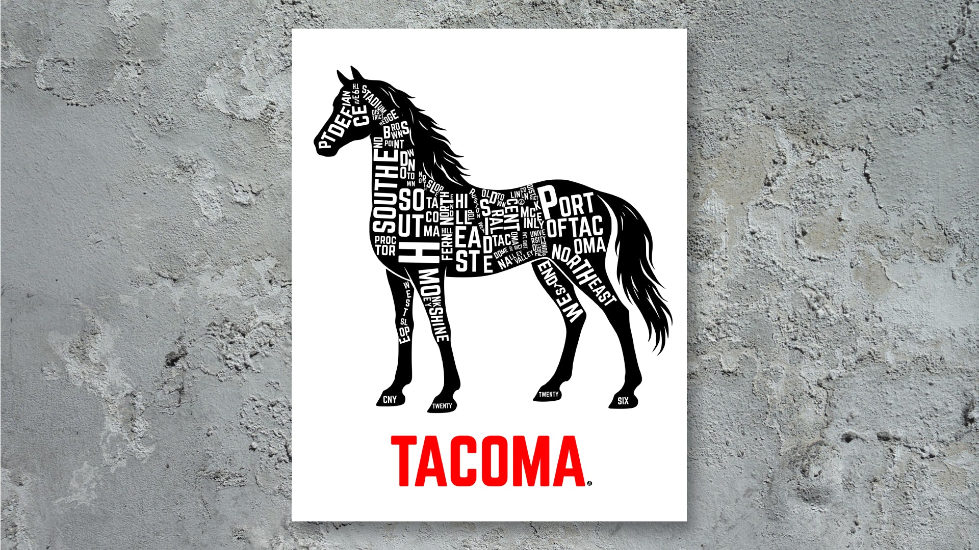 A Tacoma neighborhood map transformed into the shape of a horse, created as part of the Monkeyshines tradition. This project blends place, symbolism, and public art, turning familiar neighborhood names into a piece meant to be discovered, photographed, and passed along.